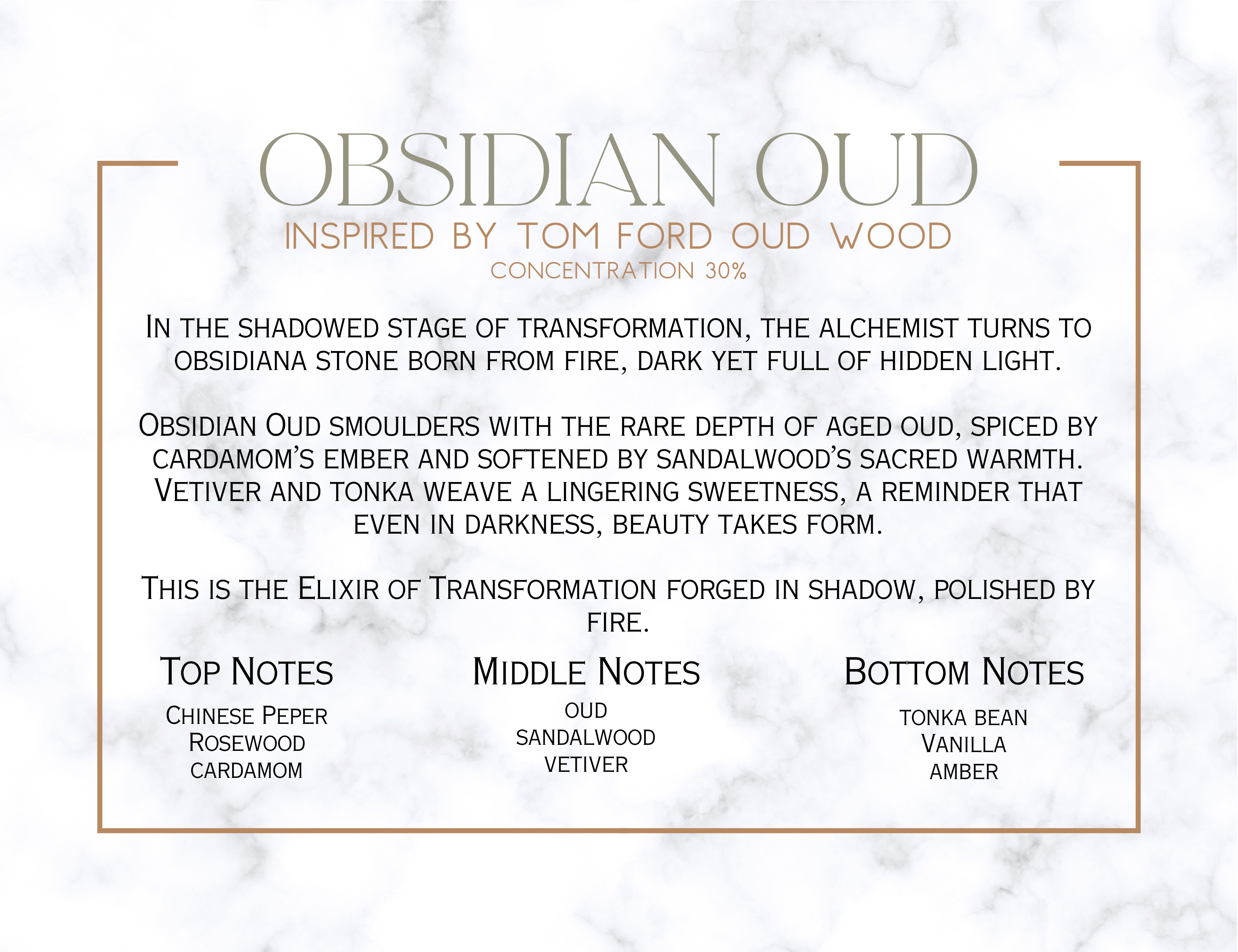 Obsidian Oud draws from the alchemical stage of Nigredo — the black work, where elements are broken down to be reborn. Perfect for those who are Dark. Refined & Magnetic.